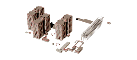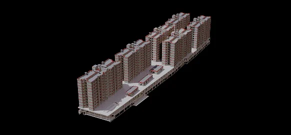 Condomínio composto por 6 torres de 10 pavimentos em alvenaria estrutural sob 2 pavimentos de embasamento em concreto armado, aproximadamente 60.000 m².